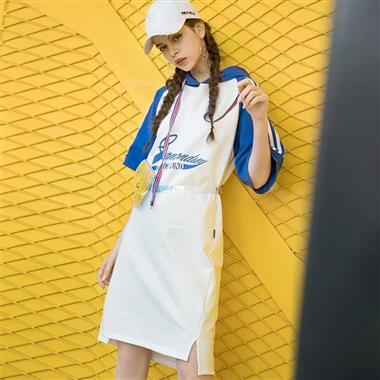 2018夏拼色袖子连帽连衣裙女宽松中长款字母印花ins超火裙子